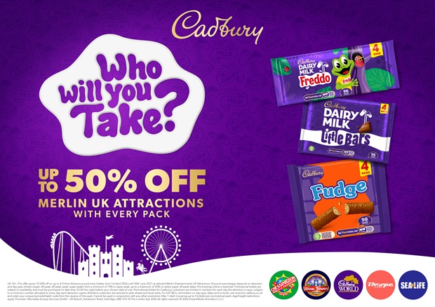 Cadbury, the nation’s No.1 confectionery supplier[1], is continuing its long-term partnership with Merlin Entertainments to bring back the Who Will You Take? on-pack promotion. The partnership leans into moments of fun, humour and heartfelt generosity, reflecting the spirit of Cadbury, while supporting retailers with an engaging promotion designed to drive footfall to stores.
